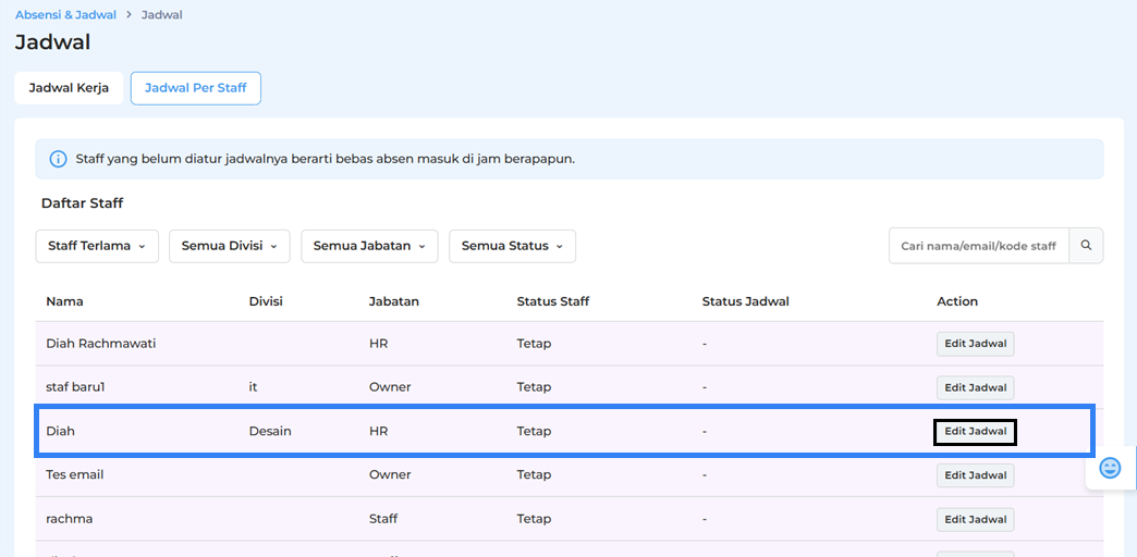 - Pilih Nama Staf, lalu klik tombol Edit Jadwal.