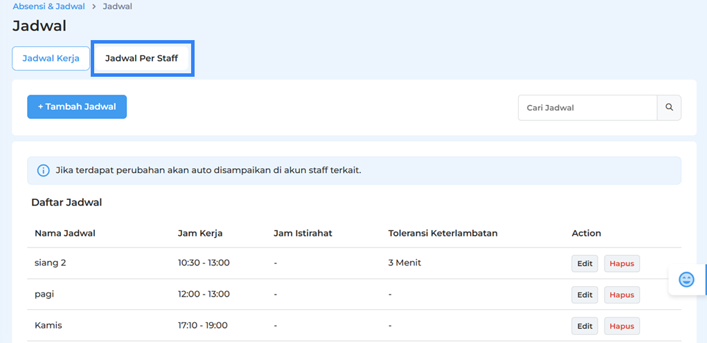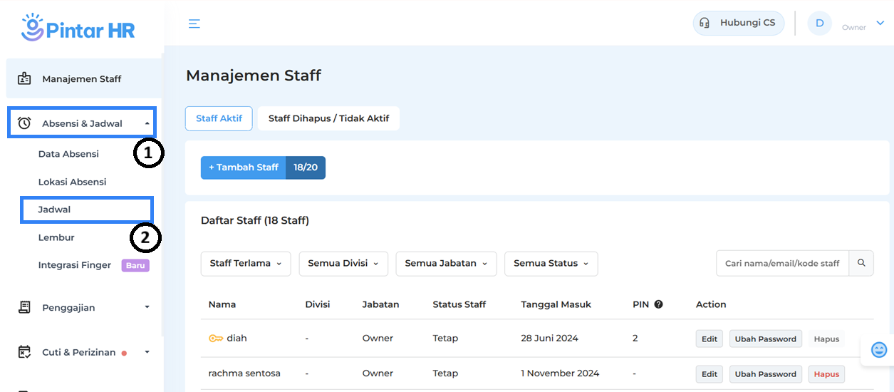 - Klik menu Absensi & Jadwal > Pilih submenu Jadwal.
