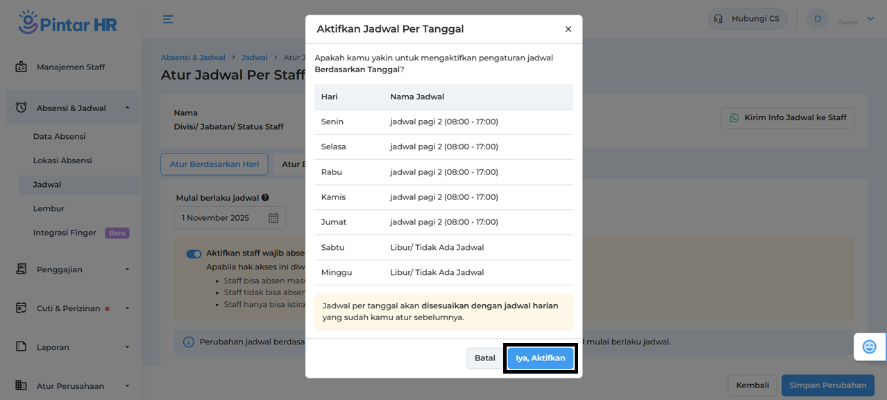Sistem akan menampilkan notifikasi Aktifkan Jadwal Per Tanggal, lalu klik Iya, Aktifkan.