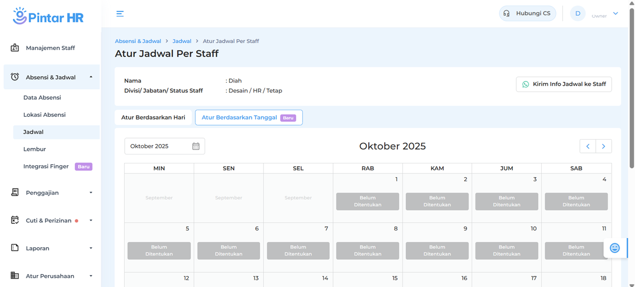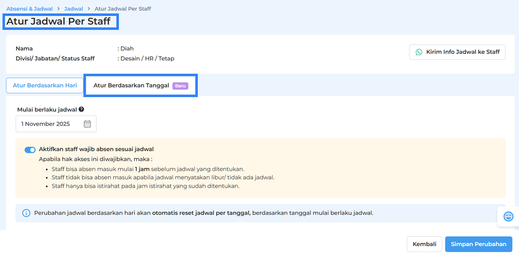 - Pada halaman atur jadwal per staf, klik tab Atur Berdasarkan Tanggal.