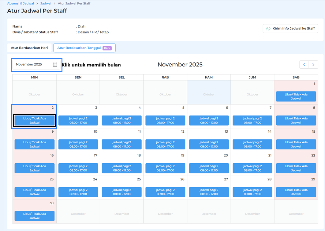 Pilih bulan dan tanggal yang akan diatur jadwal stafnya sesuai kebutuhan.