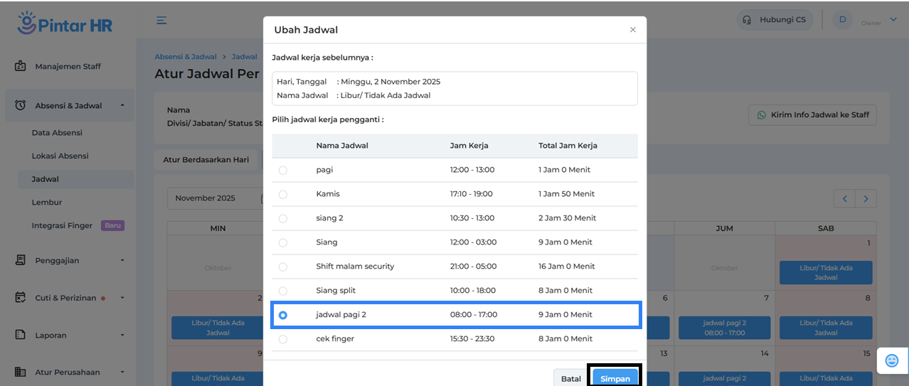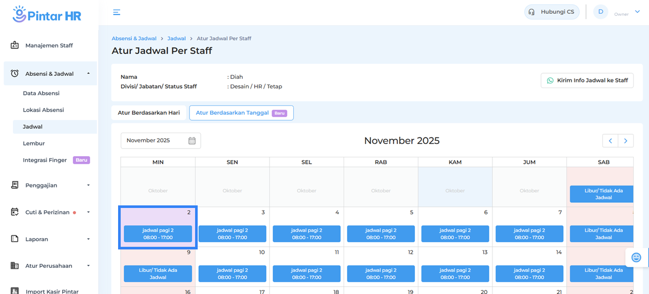 Contoh: Sania sebagai owner memilih tanggal 02 November untuk diatur jadwal staf.
