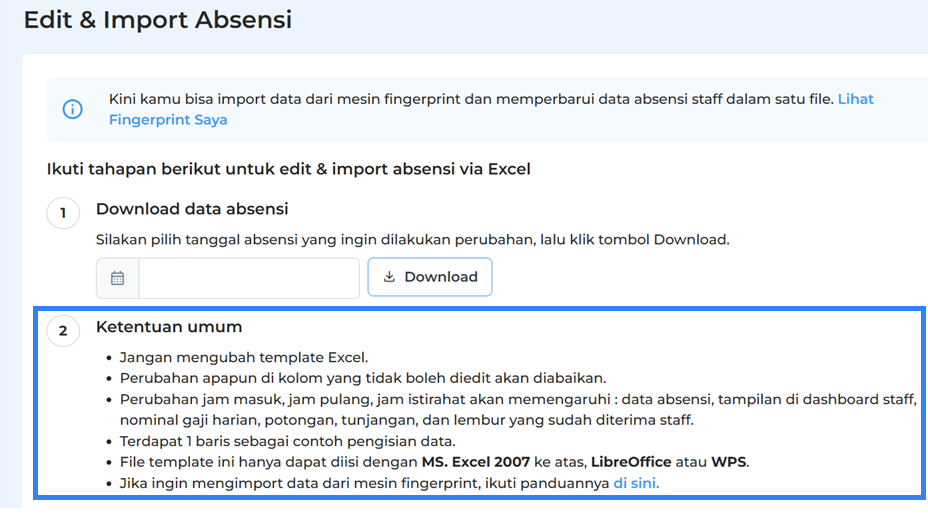 Fitur Edit & Import Absensi digunakan untuk menyesuaikan data kehadiran staf secara lebih cepat melalui file laporan absensi. Dengan fitur ini, Anda sebagai owner dapat melakukan tindakan seperti