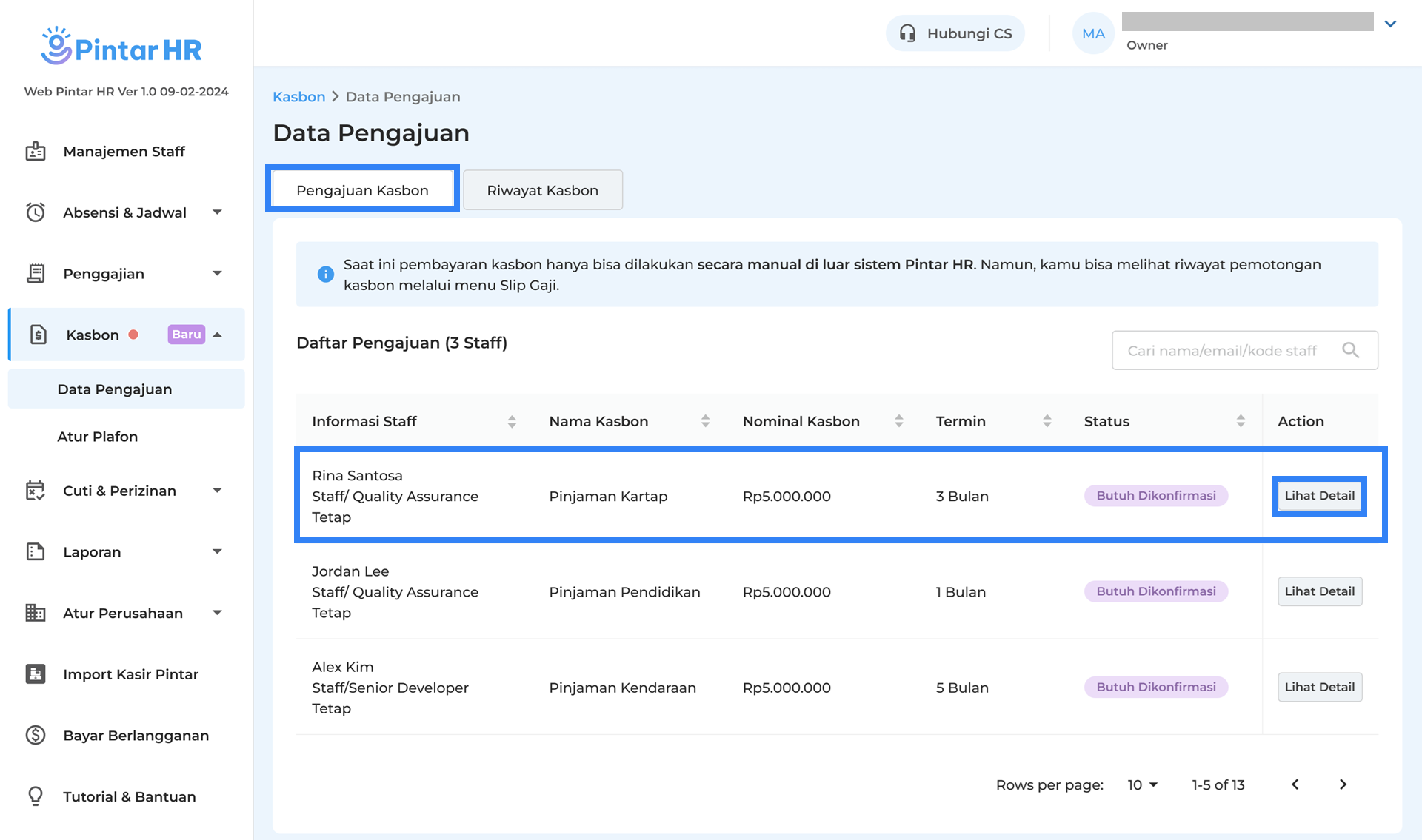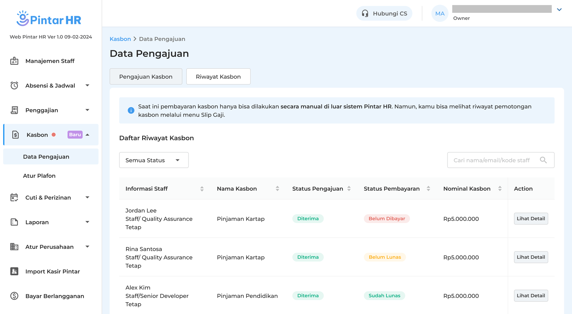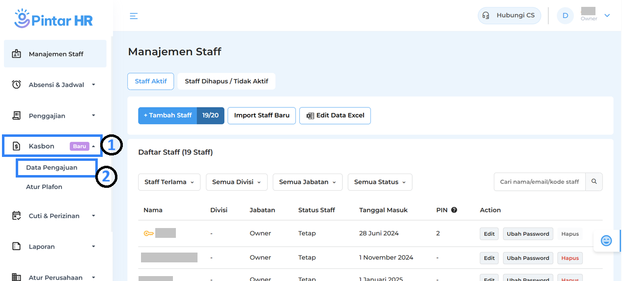 Melalui menu Data Pengajuan, owner dapat menyetujui, menolak, dan melihat riwayat pengajuan kasbon staf dengan mudah. Berikut merupakan panduan untuk Menerima dan Menolak Pengajuan Staff di Pintar HR yang bisa dilakukan oleh Owner :