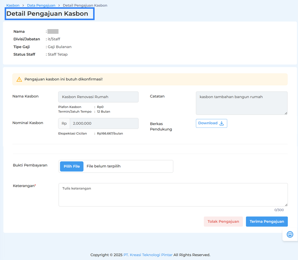 Klik tombol Tolak Pengajuan untuk menolak pengajuan kasbon staf.