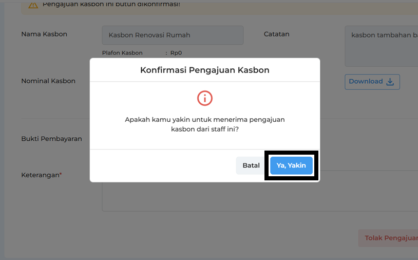 Lalu, klik Ya, Yakin untuk mengonfirmasi persetujuan pengajuan kasbon.