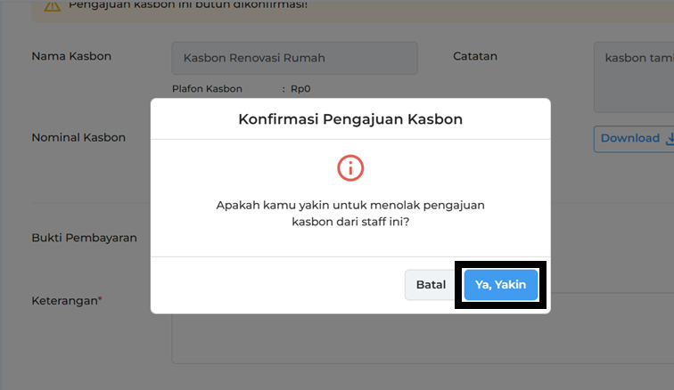 Lalu, klik Ya, Yakin untuk mengonfirmasi penolakan pengajuan kasbon.