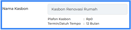 Pada kolom ini ditampilkan nama kasbon yang sedang diajukan oleh staff. Di bawahnya juga ditampilkan informasi plafon kasbon dan termin/jatuh tempo dari kasbon tersebut.