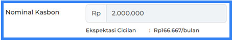 Kolom Nominal Kasbon menampilkan jumlah kasbon yang diajukan oleh staf, serta informasi estimasi cicilan di bawahnya.